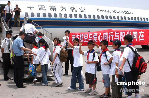 6月2日中午,成都双流国际机场,89名来自北川、彭州、宝兴、崇州等地震灾区失去亲人的儿童,乘坐南方航空海南分公司的爱心专机前往海南三亚,进行为期半个月的“爱心呵护、阳光行动”心灵呵护之旅。他们中年龄最大的16岁,最小的8岁。中新社发 尹海明 摄