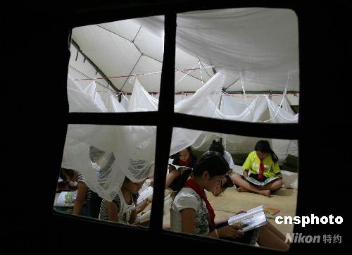 图:地震灾区的孩子在帐篷学校刻苦夜读