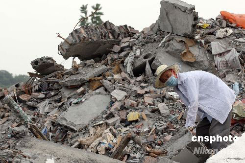 图为都江堰向娥中学的一名员工在灾后的教学楼废墟中寻找自己的物品。在5.12汶川大地震中,四川省都江堰市向娥乡几乎被夷为平地,向娥中学教学楼倒塌,有320多名学生遇难。中新社发 毛建军 摄