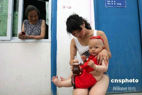 四川都江堰灾民安置点的灾民都住进了简易房。图为6月5日简易房前的祖孙三代。中新社发 杜洋 摄