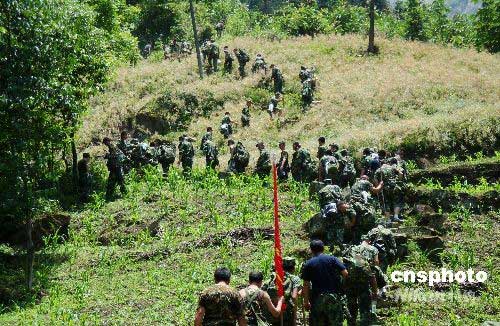连日来,四川某预备役高炮师500余名官兵,攀峭壁、越深谷、钻密林,冒着随时发生塌方和泥石流的危险,进入映秀、漩口等深山丛林,搜救在5月31日执行任务返回时失事的直升机。中新社发 王玖成 摄