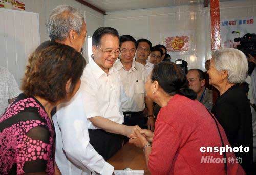 6月6日上午,国务院总理、国务院抗震救灾总指挥部总指挥温家宝,四川绵阳居民疏散安置点,看望部分转移安置群众,并与安置点老人亲切交谈。中新社发 蒲滔 摄