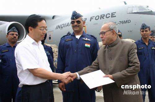 6月7日下午,首次访华的印度外长慕克吉回国途中特地在四川成都双流机场停留,与四川省副省长黄小祥短暂会面,慰问四川灾区人民。图为慕吉克外长将刚抵达成都的印度第八架救援物资清单转交给黄小祥副省长。中新社发 黄永莉 摄