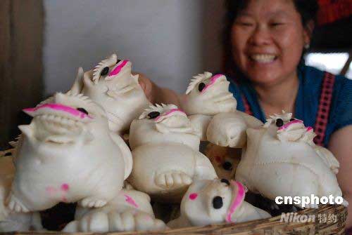 2008年6月7日,居民在赶蒸老虎馍喜迎端午佳节。过端午蒸老虎馍,敬奉怀念祖先,祈祷“平安、吉祥、和谐”是山西晋南运城一带群众敬奉古代诗人屈原和祖先流传的传统民间习俗和传统面食艺术。中新社发 高新生 摄