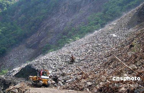 武警交通直属工程兵的官兵在五月底抢修打通卧龙至耿达乡的地震受毁公路后,正冒着不停有坠落飞石的危险抢修从耿达乡至5·12大地震震中映秀镇的公路。由于从西线进入大熊猫故乡卧龙的的公路冬季将被冰雪封路三至四个月,因此必须在冬季到来之前打通这条被地震彻底摧毁的“卧龙大熊猫生命之路”。中新社发 江湖 摄