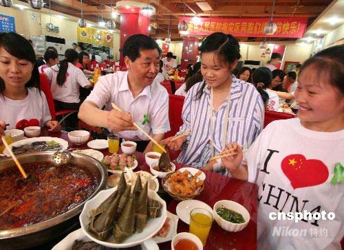 2008年6月8日,在汶川地震中受伤的伤员在重庆巴南区一火锅店同当地人民医院的医护人员一道烫火锅吃粽子,共度端午传统佳节。中新社发 贺终荣 摄