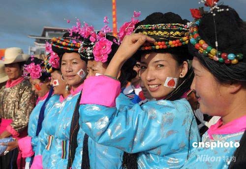 图:"女儿国"的摩梭女欢庆奥运圣火到来