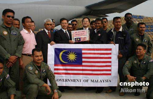 6月10日,马来西亚政府捐赠四川地震灾区的首批救援物资,由两架军用专机运抵成都。四川省方面与马来西亚方面在机场停机坪进行了简短的物资交接。中新社发 黄永莉 摄
