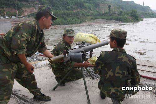 6月10日,唐家山堰塞湖泄洪流量迅速加大,泄流量曾超过6000立方米/秒,堰塞湖下游立即采取了应对措施。图为为确保水面漂浮物不对下游桥梁造成损害,驻滇某集团军战士准备炮击水面危险漂浮物。中新社发 黄荣 摄