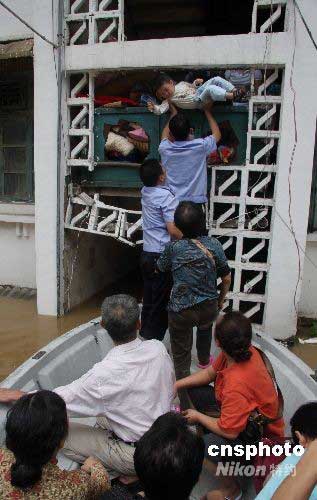 6月13日,广西柳州市水上派出所在滨江西路营救被水围困的居民。连日来的强降雨造成柳州市出现严重洪涝灾害,市区多条道路因洪水、内涝受阻。柳州数百公安民警紧急行动,全力疏导交通、救助转移被困群众。中新社发 梁健 摄