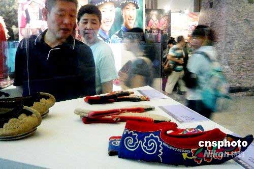 6月15日,北京民族文化宫举办的《四川地震灾区羌族文化展》吸引众多参观者举办此次展览,就是为了抢救、保护羌族文化遗产,让广大观众更多地了解羌族及其历史和文化。展览将通过“美丽记忆”、“山崩地裂”、“托起明天”三部分,展示羌族生产生活用具和服饰等方面的实物100余件,有关羌族文化的图片资料及记者从抗震救灾前线拍摄的新闻图片300余幅,以及地震发生以前羌族珍贵纪录片。图为展览展示羌族生活用具和民族服饰品。中新社发 钱兴强 摄