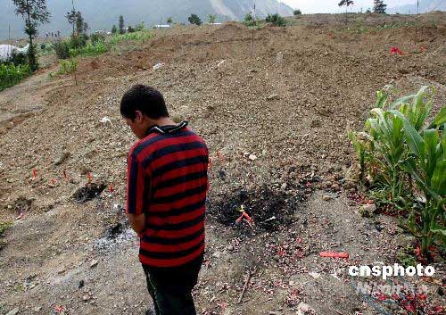 6月15日,四川汶川大地震灾区民众度过难忘的父亲节。图为映秀镇一位幸存男孩来到此次地震遇难者千人公墓大土堆前,默默想念埋葬在这里的遇难父亲和家人。中新社发 贾国荣 摄