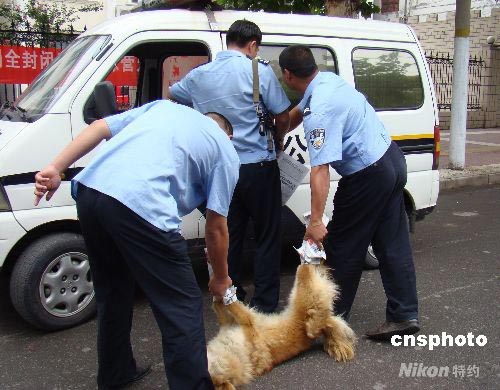 2008年6月16日中午,一条疯狗闯进河南省武陟县城和平路县直幼儿园附近并在围墙边游荡,见人就咬,连续咬伤5名过往行人。此时已接近放学高峰,一旦咬伤学生后果不堪设想。武陟县110接到群众报警后,立即出动4名警力携带微冲等捕杀工具赶至现场,经过20多分钟追击堵截,警察最终将疯狗逼到一小胡同内,一名警察仅开一枪就将疯狗打死。目前,被疯狗咬伤的人员仍在医院抢救。中新社发 雒根生 摄