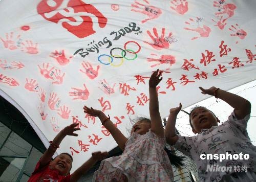 6月17日,距离北京奥运会还有52天,北京奥林匹克社区的50多位市民聚集在一起,在印有奥运会会徽的旗帜上印下自己的手印,共同迎接奥运会倒计时50天。 中新社发 杜洋 摄
