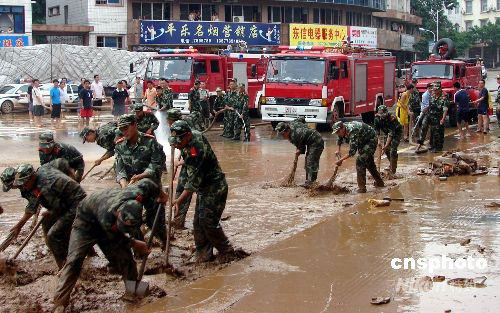 6月19日,洪水消退后的广西桂林市平乐县街道遗留大量淤泥和垃圾,桂林消防官兵与市民在忙着清理。此次南方暴雨使平乐县遭受了几十年不遇的洪灾。中新社发 王俊仕 摄