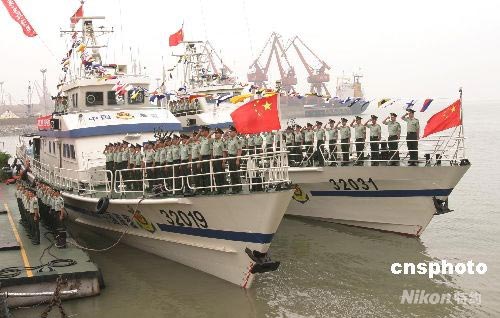 6月19日,江苏公安边防总队海警支队青岛奥帆赛海上安保出征誓师大会举行。苏浙两省公安边防海警部队共5艘舰艇参加“青岛奥帆赛海上安全保卫”工作,这支海警部队的官兵大都参加过去年在青岛举行的“公安海警奥运海上安全保卫反恐演习”,并经过层层选拔,参加了数百次的夜航、舰艇礼仪、军事技能等训练,并针对奥运海上安保过程中可能出现的各类突发事件进行了针对性训练和演练。 中新社发 王健民 摄