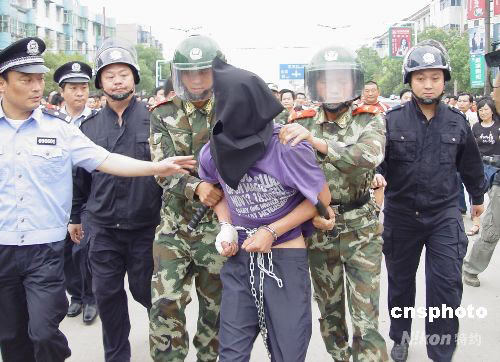 6月21日,犯罪嫌疑人方某被安徽省六安市舒城县公安局民警押回。6月17日,因为“姐弟恋”遭到女方父母反对,犯罪嫌疑人方某窜入比他大6岁的女友李某家,将其父母等祖孙4人杀害。经过近60个小时的侦破和缉拿,6月21日上午10时许,安徽省六安市舒城县警方从千里之外的浙江江山市将犯罪犯罪嫌疑人方某押回舒城。中新社发 张发平 摄