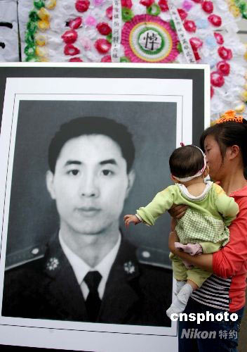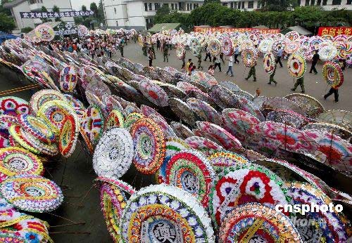 6月21日,在都江堰市胥家镇抗震英雄武文斌烈士的灵堂前,各地群众敬献的花圈已达两千余个,数千民众自发来到抗震英雄武文斌烈士的灵堂前进行悼念。26岁的济南军区“铁军”部队炮兵指挥连二期士官武文斌,因连日救灾劳累,于6月18日4时45分牺牲。6月21日,济南军区某集团军作出决定,为牺牲在抗震救灾第一线的某红军师实习士官学员武文斌追记一等功,并批准为烈士。中新社发 曾宪平 摄