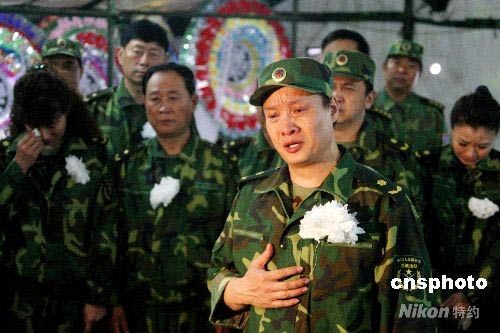 6月22日,阎维文、黄宏、梦歌、蔡国庆、白雪等著名军旅艺术家来到四川都江堰悼念抗震救灾烈士武文斌。图为阎维文在烈士的遗像前清唱一首《心肝情愿》告慰英灵。中新社发 曾宪平 摄