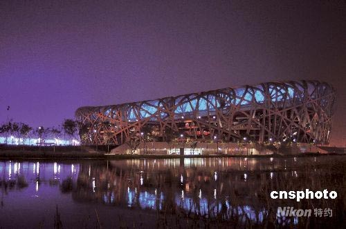 奥运离中国国人越来越近,6月下旬,奥运主要场馆——“鸟巢”因加紧调试灯光系统而停止外部的照明,但加紧开幕式排演的灯光却要亮到深夜。 中新社发 杨佐桓 摄