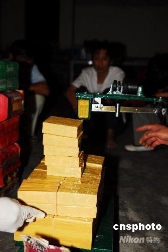 2008年6月20日,云南省临沧市公安局禁毒支队成功破获一起特大贩毒专案,缴获毒品海洛因236块,重计84.27千克,抓获涉案犯罪嫌疑人10名(其中甘肃籍4名,云南大理籍1名、临沧籍5名),缴获单管猎枪、勃兰宁手枪各1支,各类子弹150发,运毒车5辆及一批涉案脏物。该案是今年云南省破获的最大一起海洛因贩毒案件。中新社发 李春俊 摄