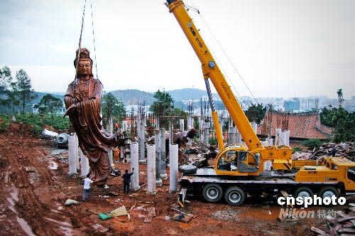 六月二十五日,一尊由非洲菠萝格红木雕刻而成的“和平观音”像在泉州少林寺安装立位。此尊身长九米、底座三米、总高十二米的观音,手结契印、脚踩荷花、右手祈祷、左手持净瓶,寓意着世界和平、国泰民安。据工艺大师黄泉福介绍,这是目前中国最大的木雕“和平观音”像。中新社发 傅丹丹 摄