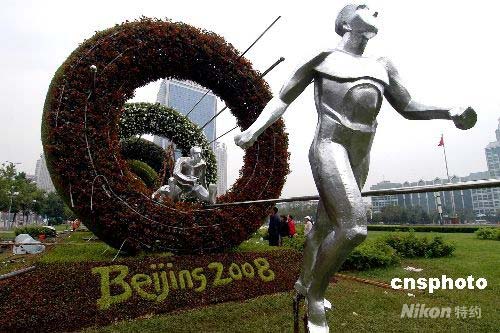 6月30日,沈阳市政府广场西侧的大型立体组合花坛雕塑《腾飞》完工。该雕塑是继大型花坛雕塑《中国印》之后,绿化部门为了迎接奥运会又一大手笔。该雕塑高5米、长20米,用了万余盆五色花卉装点五环。雕塑表现了一名运动员正在跨越奥运五环的各个瞬间,生动形象、寓意深刻。 中新社发 文契 摄