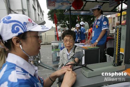 7月1日,北京40万名城市志愿者在全市500多个志愿者岗亭正式上岗,位于东四北大街的东四奥林匹克社区的志愿者岗亭里,志愿者们都在忙忙碌碌的进行着志愿服务,图为志愿者义务为市民测量血压。中新社发 杜洋 摄