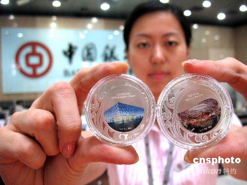7月3日,中国银行济南分行的银行职员展示奥运场馆纪念章。这套由北京奥组委授权制作的纪念章展示了鸟巢、水立方等奥运场馆,深受济南市民喜欢。 中新社发 周青先 摄