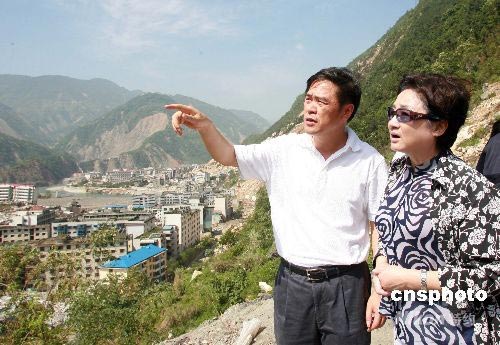7月5日,国务院侨办主任李海峰率领首批20余位知名侨商在四川北川县城考察,群山之中的县城房屋坍塌成片,令人揪心。中新社发 廖文静 摄