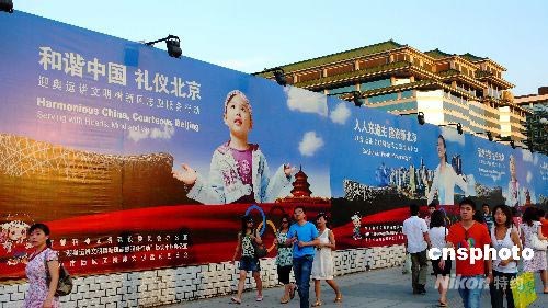 7月6日,北京西单街头奥运宣传画格外引人注目。随着奥运会临近,北京大街小巷的奥运气息越来越浓。 中新社发 张爱东 摄