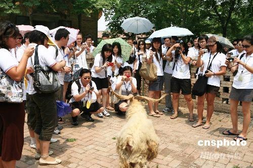 7月7日,由海外18个国家和地区的243名优秀华人子弟组成的“第九届海外杰青汇中华访问团”来到陕西杨凌,参观了西北农林科技大学国家重点实验室----人工模拟降雨大厅和该校培育的世界首批成年体细胞克隆山羊“阳阳”以及世界上最大的胚胎克隆羊群体。据了解,“海外杰青汇中华” 访问团是以帮助海外华裔大学生“了解现代中国 认识文化根源”为宗旨的活动。访问团除了在陕西参观后还将赴北京、天津和上海等地参观。 中新社发 支勇平 摄