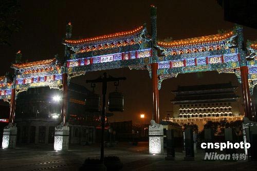 7月8日晚,前门大街北端的五牌楼“亮灯”调试,灯光映衬下,大气恢宏的五牌楼成为市民驻足观赏的夜景。据了解,前门大街基本修缮完工,各项功能性设施都已进入调试完善阶段,其中包括五牌楼的夜景照明系统。中新社发 富田 摄