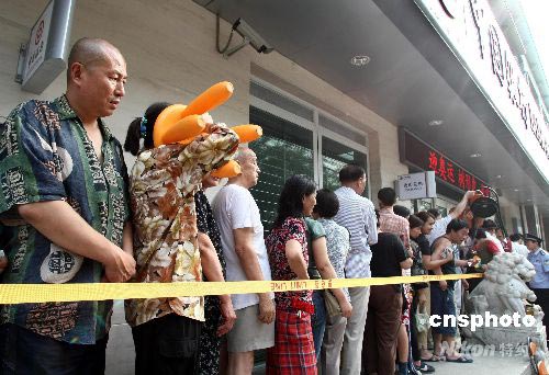 7月9日,北京,众多市民在银行门前排队等候兑换奥运纪念钞。由央行发行的600万张10元面额奥运纪念钞,9日与北京市民见面。北京市工商银行、农业银行、中国银行、建设银行、交通银行5家商业银行约300个营业网点面向社会兑换纪念钞,规定每人仅限兑换一张。许多市民甚至连夜排队等候。中新社发 盛佳鹏 摄