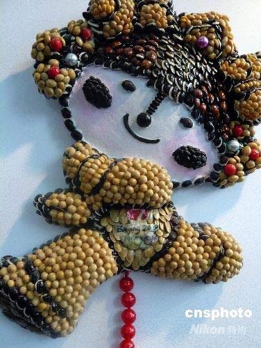 7月9日,为期一周的中国农民艺术展在北京落下帷幕。展览突出“民俗风、乡土韵、奥运情”三大元素,由乡村工艺名家作品展、中国农民画展、新中国农业宣传画展三个部分组成。剪纸、皮影、织绣、印染、风筝、布艺、编结(竹编、草编)、雕塑(根雕、蛋雕、木雕、泥塑、面塑)以及独具特色的葫芦艺术、蝴蝶艺术、插花艺术、茶具艺术、微缩传统农具等作品在展览上展出。图为用豆子创作的奥运会福娃新颖别致。中新社发 钱兴强 摄