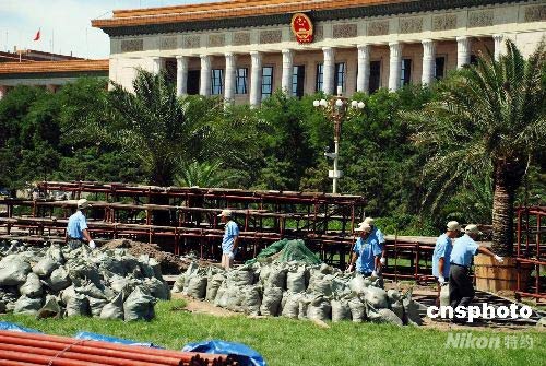 7月12日,天安门广场正在布置花坛,预计将摆放100万盆鲜花,形成以“中国印·舞动的北京”为主景的花海。奥运会期间,天安门广场和京城主要街道将摆放1500万盆鲜花。广场花坛将跨越奥运会、残奥会和国庆节,自夏至秋持续三个多月。这是自1986年天安门广场开始摆花以来时间最长的一次。中新社发 杨慧峰 摄