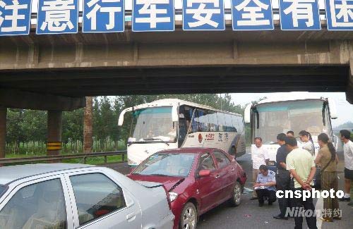 京津高速安全行驶标语下的车祸。7月18日18点,在天津通往北京的高速公路上,3辆轿车、1辆大巴车、1辆满载乘客的机场大巴车追尾相撞,事故无人伤亡,但造成交通堵塞,公安交警及时赶到进行了处理。中新社发 钱兴强 摄