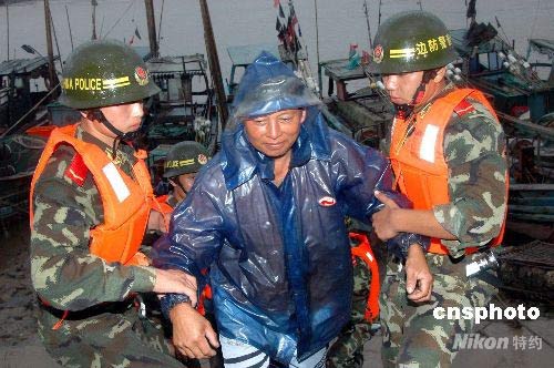 7月18日傍晚,2008年第7号台风“海鸥”登陆前,浙江省温州市龙港镇有四名渔民困在渔船上无法撤离。温州边防支队抗台抢险分队官兵火速赶赴救援,成功将他们安全转移上岸。中新社发 吴水斌 摄