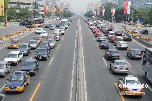 从7月20日起,北京全面实施奥运交通管制,所有车辆将按照单双号行驶,“禁飞令”、“错时上下班”等奥运保障措施等也同时实施。随着8月8日北京奥运会开幕脚步越来越近,北京正式进入“奥运时间”。图为用黄白线划分的奥运专用车道内侧车道从当日起启用。中新社发 陈文 摄