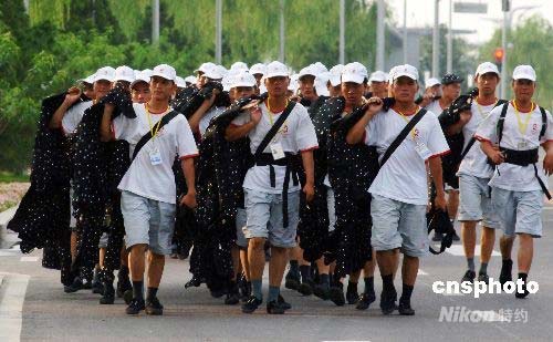 7月20日,北京奥运会开幕式演职人员带着道具走进“鸟巢”。离奥运开幕越来越近,北京国家体育场“鸟巢”里正加紧开幕式的彩排工作。中新社发 王东明 摄
