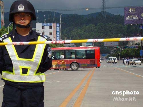 7月21日上午7时10分、8时05分左右,在云南省昆明市人民西路云大医院侧门、昌源路与人民西路交叉口分别发生公共汽车爆炸案。图为警方在昌源路与人民西路交叉口爆炸现场拉起警戒线,禁止一切行人车辆通过。中新社发 杨洋 摄