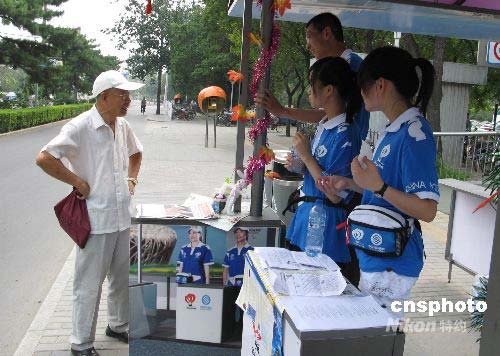 7月21日,以大学生为主体的奥运志愿者们,在100多个由中国移动通信援助的“北京奥运会志愿者服务站亭”中,为市民和中外游客解答奥运比赛场馆及交通服务知识。中新社发 邹宪 摄