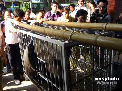 7月22日下午,一只来自四川地震灾区的熊猫被送入南京军区福州总医院进行全面体检,这只熊猫体重92公斤,年龄推测20岁左右,是大地震前几个月刚从野外救护来的,是一只尚未来得及进入国际系谱册的老年病猫(福州编号07),专家通过观察推测这只熊猫患有腹水、右眼白内障、牙齿磨损、脱落等疾病。中新社发 林维莉 摄