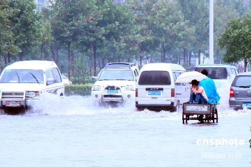 7月21日到23日,河南遭受本月第5次暴雨侵袭,降雨量约60毫米至100毫米,郑州多处路段出现深度积水。图为汽车在积水中艰难前行。中新社发 李冰 摄