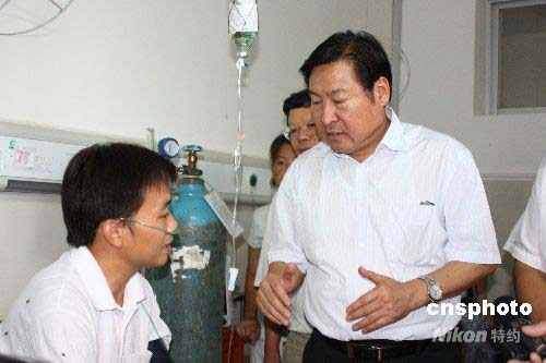 7月24日,广西田东县那读煤矿透水事故已经过去3天,国家煤矿安监局局长赵铁锤(右)到医院看望获救矿工韦明辉,了解当时事故发生情况。中新社发 曾德军 摄