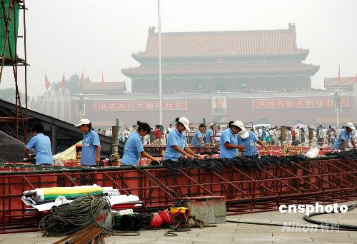 7月24日,北京天安门广场中心花坛主景周围摆放圆形花坛,并在花坛外围布置低喷泉和弥雾装置。整个广场花坛都采用了夜景照明设计,达到白天看花,晚上看灯的效果。现在整个工程正在紧张进行,预计将于26日完工。中新社发 张双双 摄