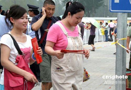 最后一批北京奥运门票于25日正式开始销售,大批市民前来抢购门票。图为一位孕妇在家人的陪同下不畏酷暑也来购买奥运门票。中新社发 叶林 摄