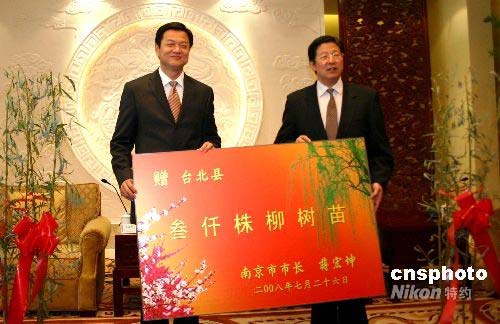 七月二十六日,南京市官员会见台北县长周锡玮一行十人,并向其赠送三千棵柳树、一幅巨型云锦作礼物。台北县南京参访团于二十五日晚间抵达南京,展开为期五天的访问。中新社发 朱晓颖 摄