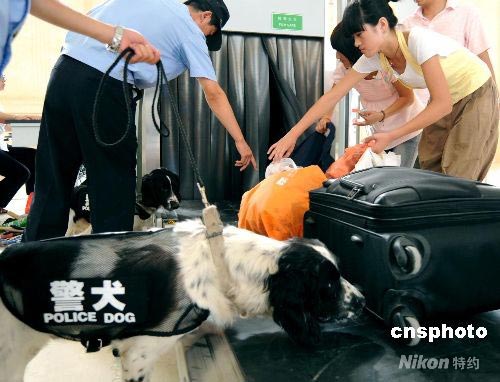 为确保二00八北京奥运会青岛奥帆赛的安全,青岛火车站铁路公安处引进德国邢侦犬、比利时缉毒犬、英国搜爆犬等犬种,对客货物品进行严格检查,在青岛火车站广场上巡逻盘查可疑人员。图为旅客进站物品通过安检后搜爆犬再次把关。 中新社发 曲连遵 摄