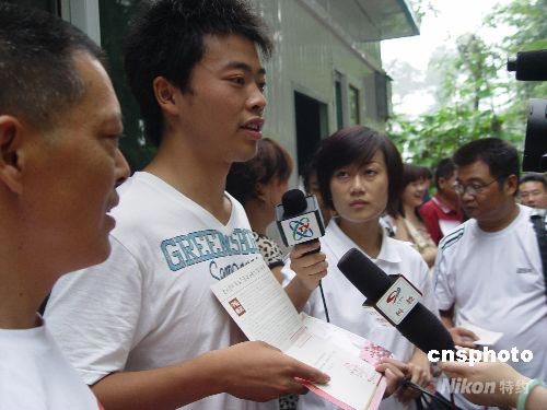 7月27日上午,“5.12”四川汶川大地震重灾区--都江堰市,都江堰中学19岁的易爽同学激动的从中国民航飞行学院党委书记朱勇手中接过高考录取通知书,一同前来的省高招办、成都市邮政局的同志向易爽同学送上鲜花祝贺,祝贺他被中国民航飞行学院正式录取为飞行技术专业学生,同时标志着四川省08年高考提前批录取工作正式开始。 19岁的易爽就读于都江堰中学,“5.12”大地震后,都江堰市成为重灾区,高考延迟到7月3日,他作为高考延迟区考生,参加了新中国成立以来规模最大的延迟高考,并以502分的总成绩考取中国民航飞行学院,成为该校提前批录取的飞行技术专业本科学生。中新社发 张钰昱 摄